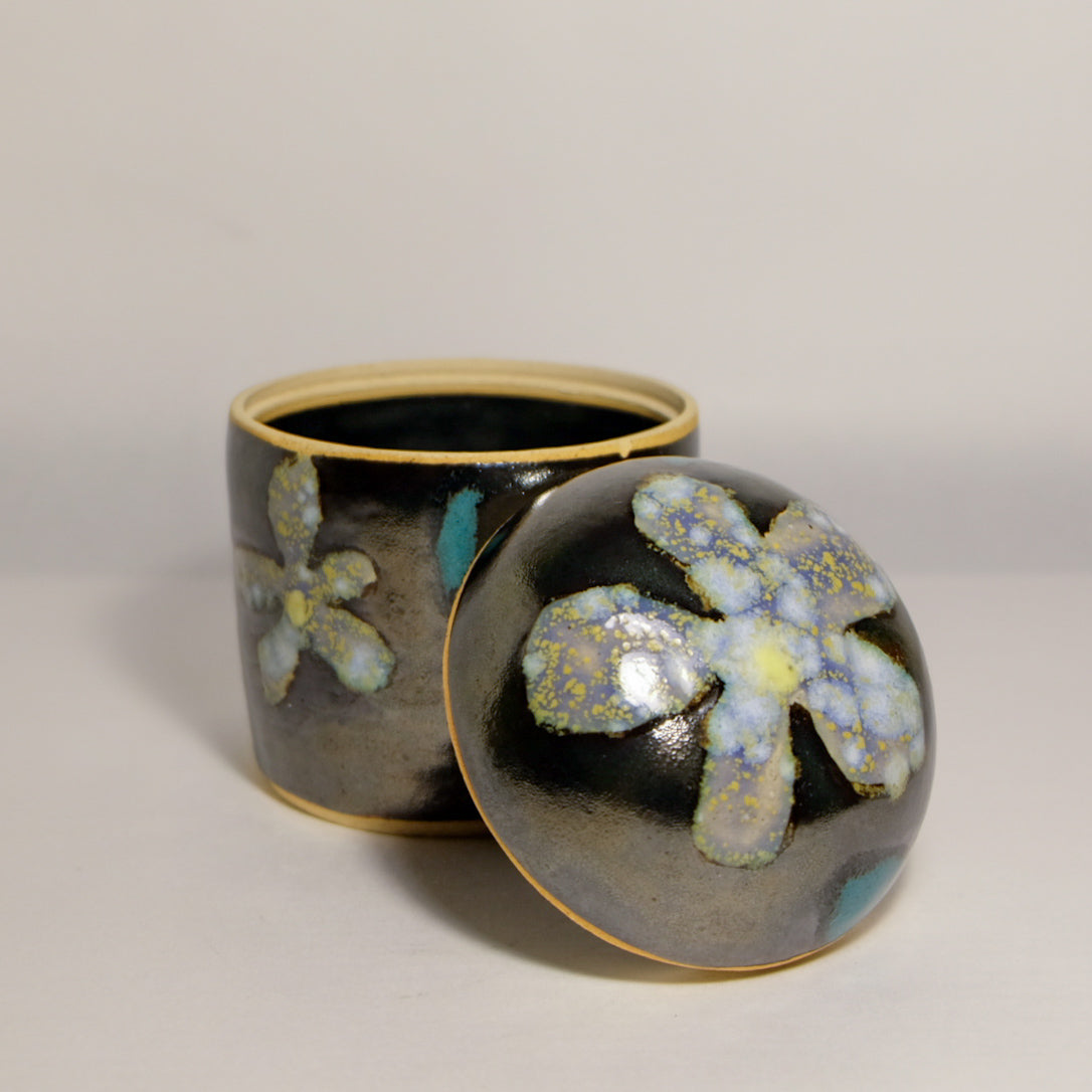 This ceramic jar is perfect for storing tiny treasures—from loose leaf tea to salt, spices, or keepsakes. Hand-glazed in deep, moody tones and adorned with delicate, dreamy blossoms, each jar is one of a kind. Its rounded shape and snug-fitting lid make it as functional as it is beautiful.