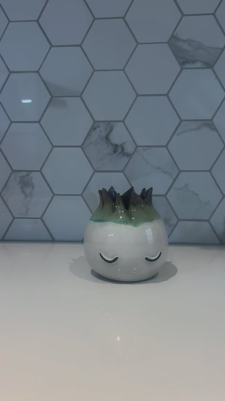 A sweet bud vase with a demure face, shaped like an onion. Use it in the kitchen to sprout green onions or herbs, hold tiny floral stems, or simply let it sit pretty on your shelf and bring a smile to your day.