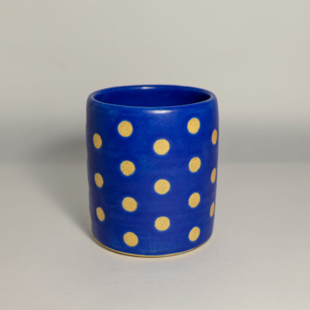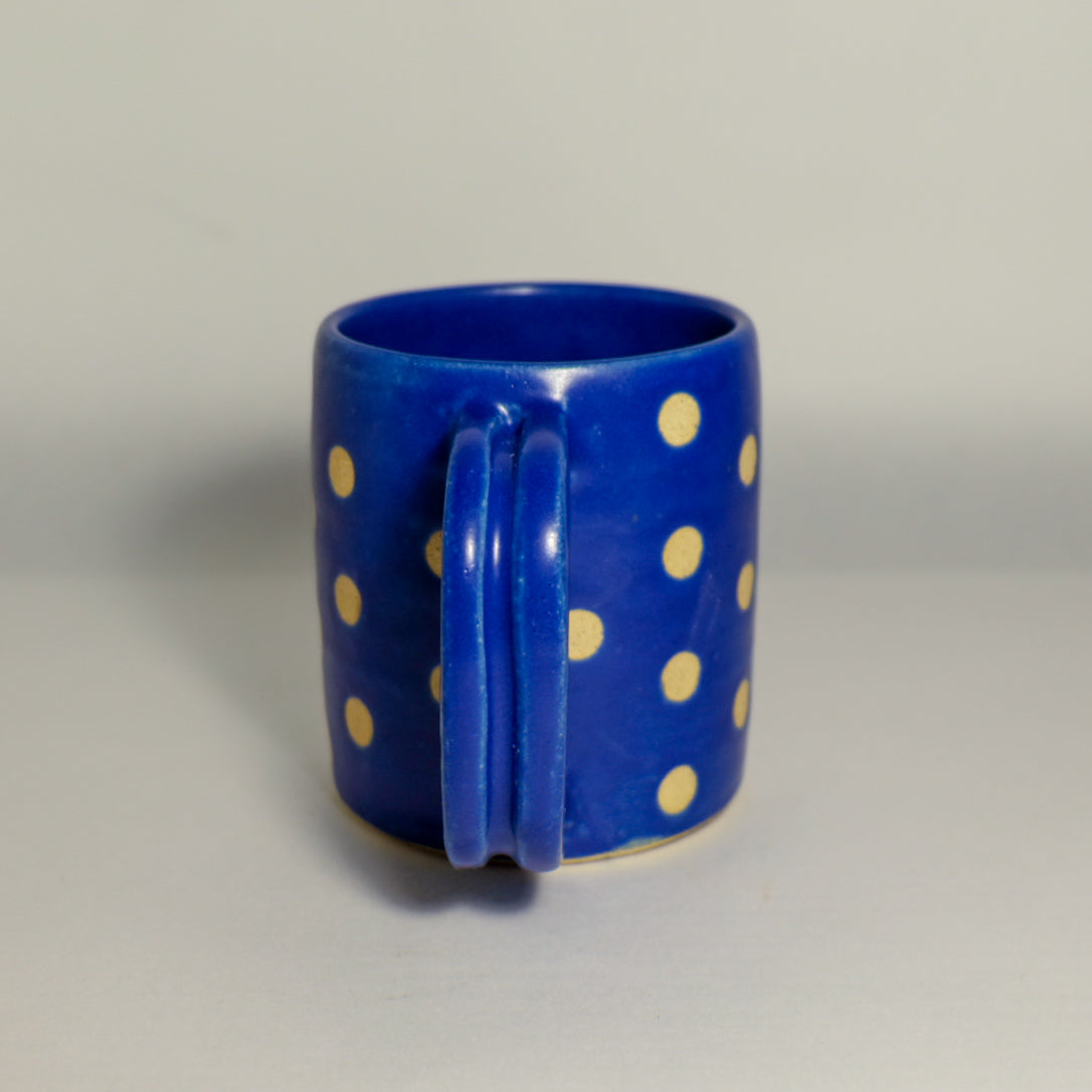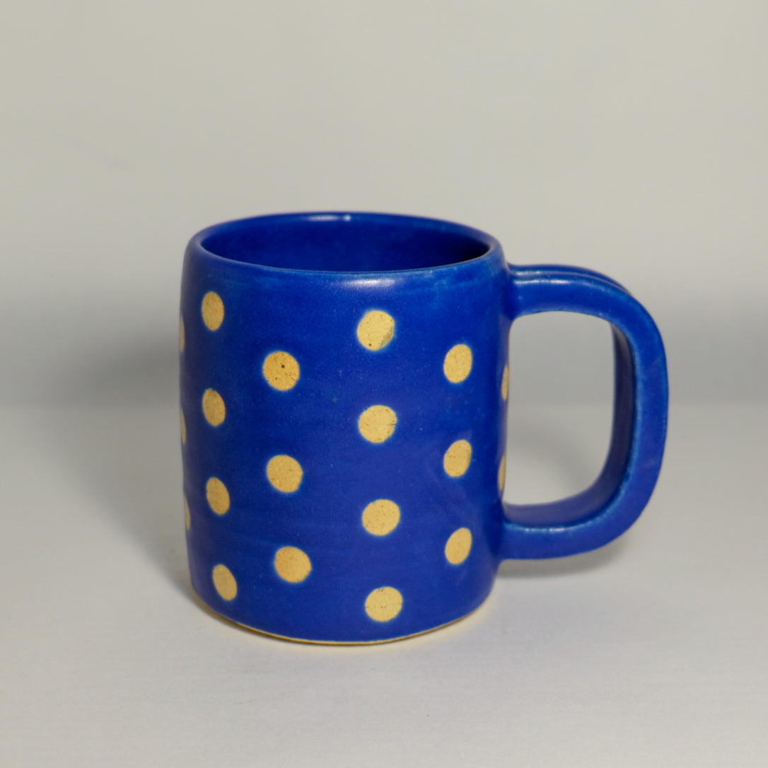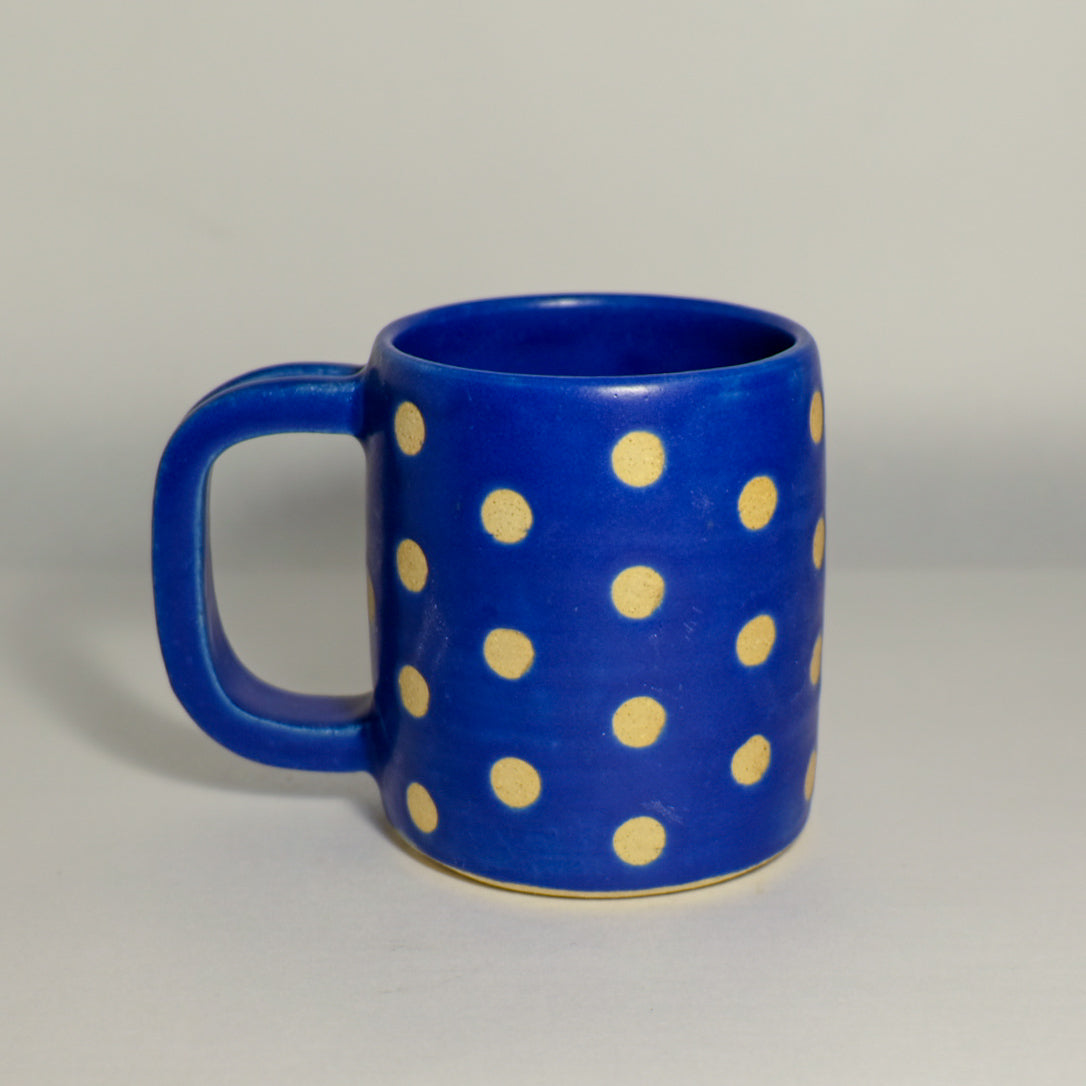 Wheel-thrown and crafted from durable stoneware, each mug is finished in a rich matte navy blue glaze with crisp white polka dots. Designed for everyday use, it's the perfect blend of function and charm.
