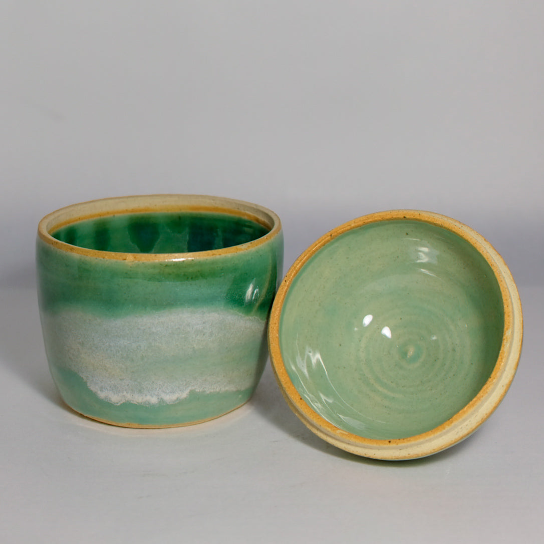 Soft layers of green and white glaze ripple around this rounded jar, reminiscent of seafoam and ocean-washed glass. Topped with a domed lid and a sculptural knob, it’s perfect for storing salt, sugar, or seaside keepsakes. A gentle, meditative piece that brings a touch of coastal calm to your shelf or table.